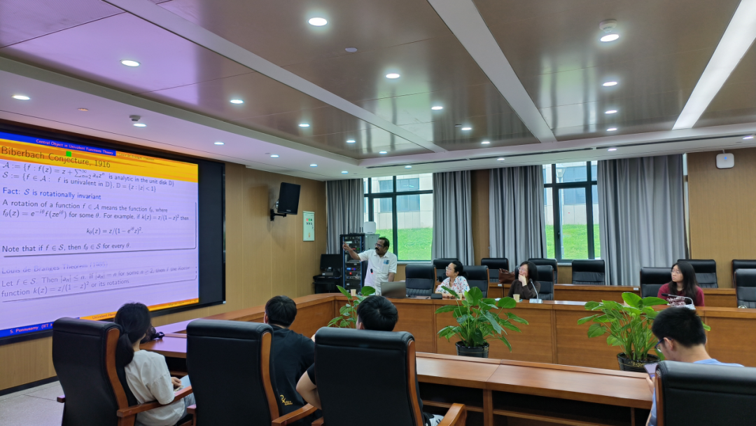 讲座中,Ponnusamy教授的报告主要是关于单位圆内单叶函数的凸性和系数。Ponnusamy教授以经典的Biberbach Conjecture(比伯巴赫猜想)为引子,援引多篇核心文献及专著,详细介绍了单位圆内的单叶函数问题的起源和发展过程。随后,Ponnusamy教授通过函数的表达式和图形的展示,重点介绍了带整系数和半整系数的单叶调和映射的个数。Ponnusamy教授不仅解释了这种函数的几何性质,还抛出了几个引人深思的问题,激发了在场员工的思维火花。与会员工们积极提出自己的见解,虚心求教,Ponnusamy教授一一解答,并给予亲切地鼓励。Ponnusamy教授的课程风趣幽默,将复杂的数学概念化繁为简,使在场的各位师生受益匪浅。讲座后,Ponnusamy教授真挚地寄语365英国上市集团的学子们,希望他们能够在数学领域上展露光芒。