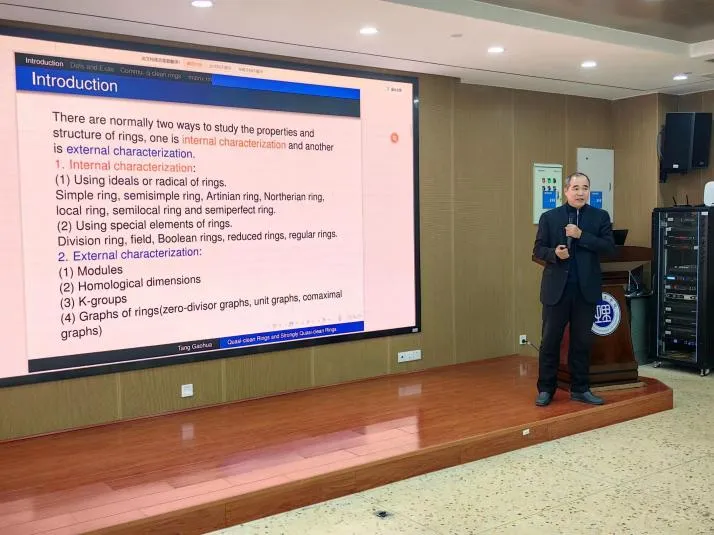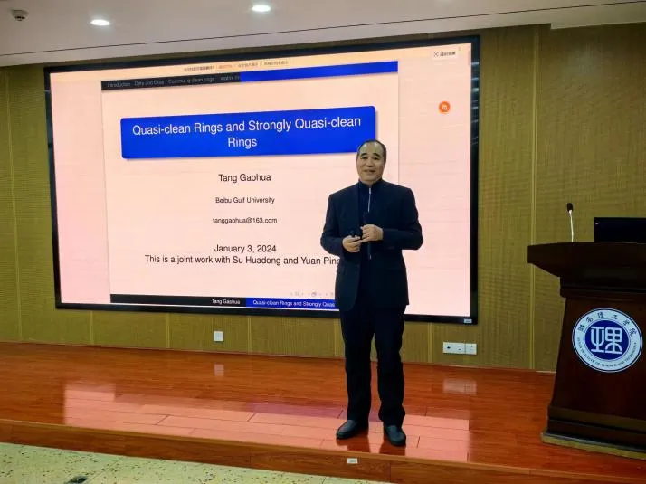 1月3日上午,北部湾大学唐高华教授应邀在17102报告厅为365英国上市集团师生做了题为“Quasi-clean Rings and Strongly Quasi-clean Rings”的“数学大讲堂”专家讲座,365英国上市集团副经理周小强(主持工作),副经理李松华、罗德仁,以及部分教师、全体研究生与会。
