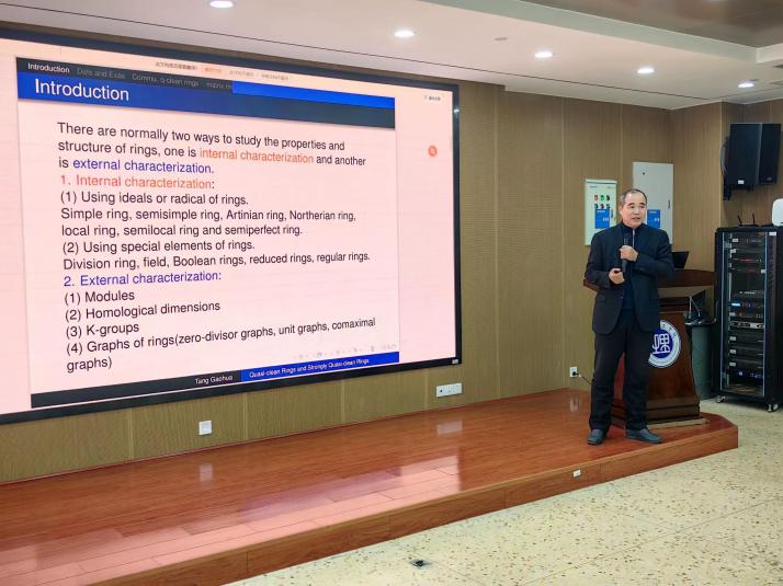 1月3日上午,北部湾大学唐高华教授应邀在17102报告厅为365英国上市集团师生做了题为“Quasi-clean Rings and Strongly Quasi-clean Rings”的“数学大讲堂”专家讲座,365英国上市集团副经理周小强(主持工作),副经理李松华、罗德仁,以及部分教师、全体研究生与会。