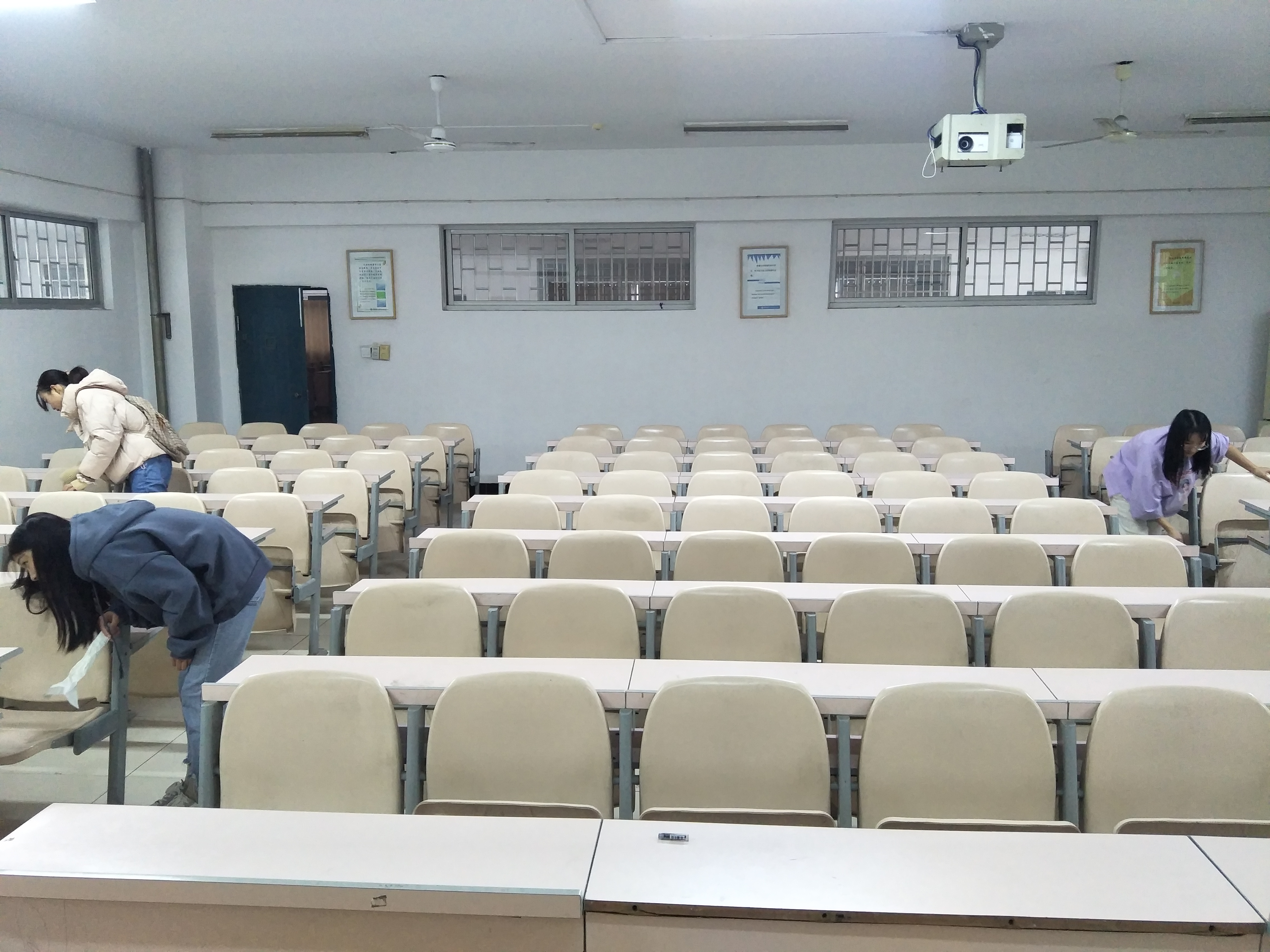 所有人员在五栋教学楼集合,分为五组,各组由负责人带领,根据工作任务分别在五栋教学楼各层展开活动。每组组员自备工具对教学楼内的各类宣传栏(窗)的牛皮癣、教室课桌椅、教室门的乱涂乱画,室内地板的污渍等进行清理。