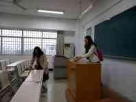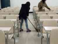 所有人员在五栋教学楼集合,分为五组,各组由负责人带领,根据工作任务分别在五栋教学楼各层展开活动。每组组员自备工具对教学楼内的各类宣传栏(窗)的牛皮癣、教室课桌椅、教室门的乱涂乱画,室内地板的污渍等进行清理。