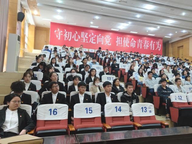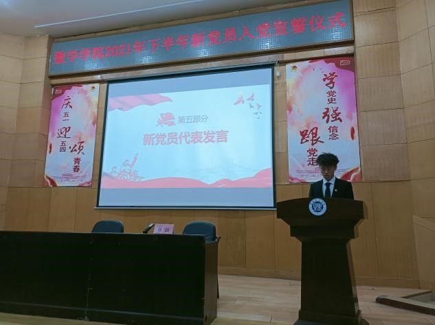 宣誓结束,预备党员代表尹威代表全体新党员向党组织做出庄严承诺:在今后的学习和生活中,将时刻以党员的标准严格要求自己,不辜负党组织的期望!随后,入党积极分子代表郭欣雨上台发言。她表示,会加强学习党的理论和方针,提高自身政治素养,积极向党组织靠拢,争取早日入党。