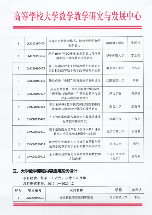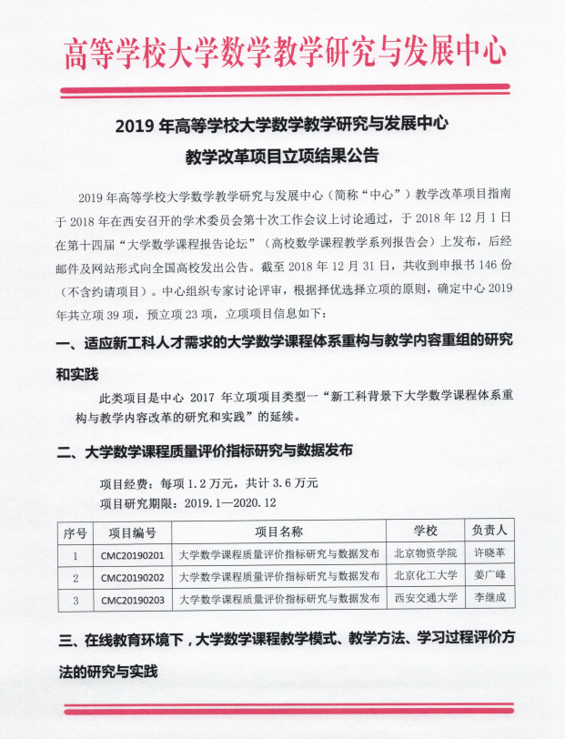 3月20日教育部高等公司大学数学教育与研究发展中心发表立项结果公告,公司张再云教授申报的“构建研究性教学模式,培养老员工数学创新能力”项目获得立项支持。