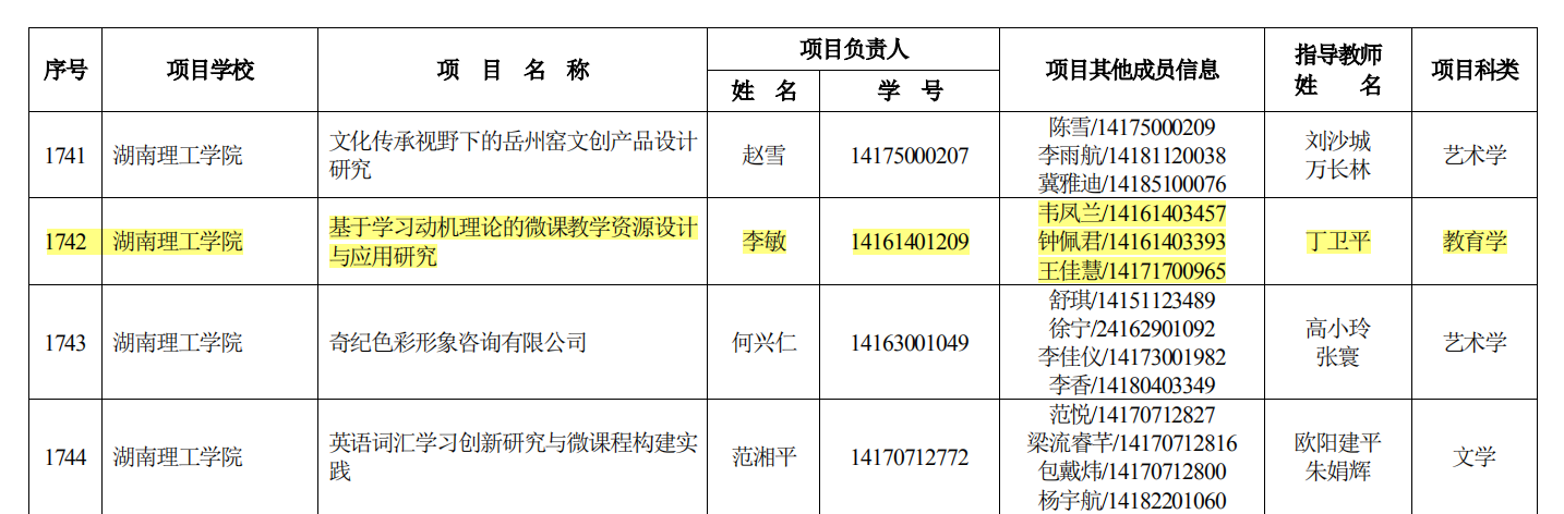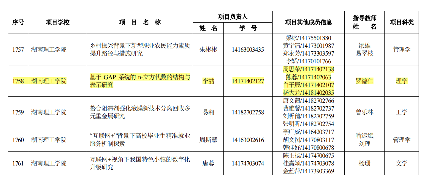 湖南省教育厅6月25日发布“湘教通〔2019〕219号 关于公布2019年度湖南省老员工创新创业训练计划项目名单的通知”,公司数学16-2BS员工李敏同学申报的“基于学习动机理论的微课教学资源设计与应用研究”(项目指导老师丁卫平)和数学17-1BS员工李喆同学申报的“基于 GAP 系统的 n -立方代数的结构与表示研究”(项目指导老师罗德仁)获得立项。