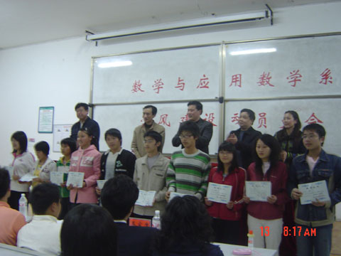 据悉,本次大会是由数学系党总支书记甘向阳老师主持。大会共分为8个议程,会上首先由数学系党总支副书记李丽荣老师作学风建设动员报告,报告中主要对本系各个班级的学风现状作了全面的概括和分析,接着数学系副主任周立仁老师宣读了2007年度先进班级、先进个人的获奖名单,并进行了隆重的颁奖仪式,数学系优秀学风班级班主任彭定忠老师和学风建设优秀个人杨阳同学分别就自己的先进事迹进行了发言,新一届员工会主席杨靖同学宣读了《加强我系学风建设提倡书》,接着数学系主任孙明保老师对本次会议作了简要的概括和总结,最后学工部部长柳周峰老师发表了指导性讲话,并对数学系学风建设给与了充分的肯定。