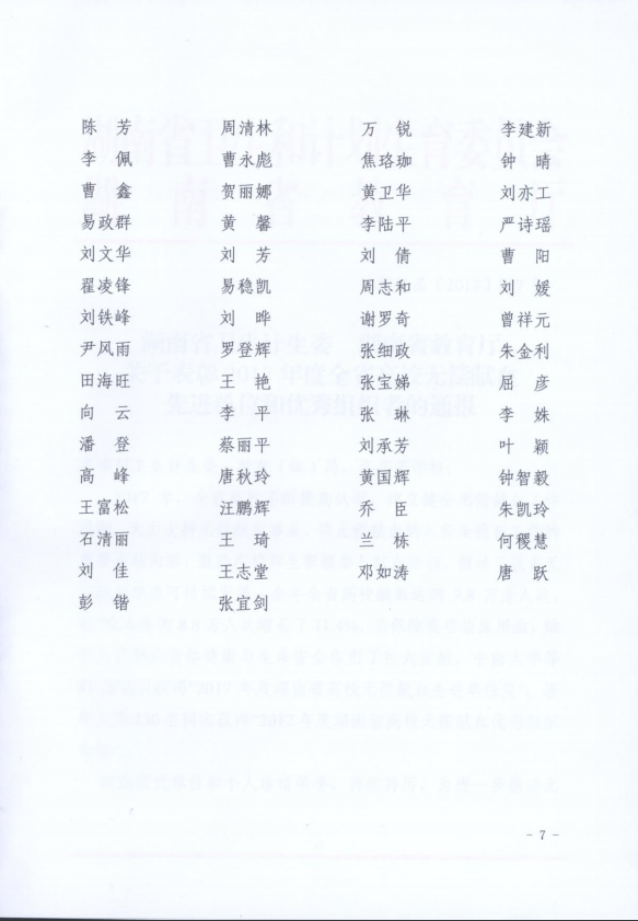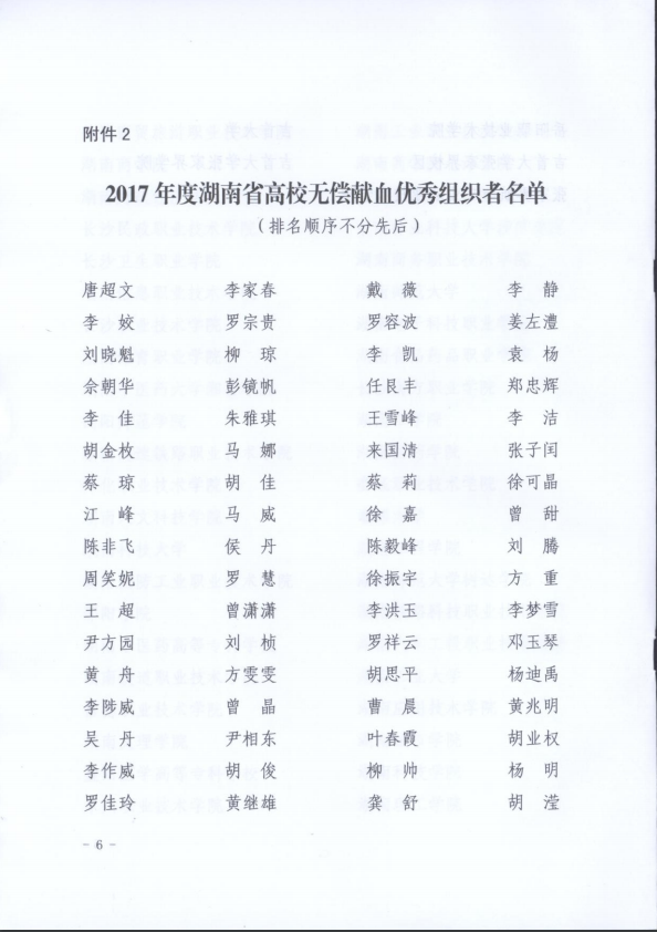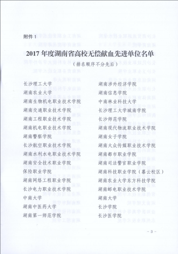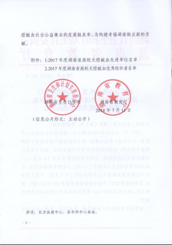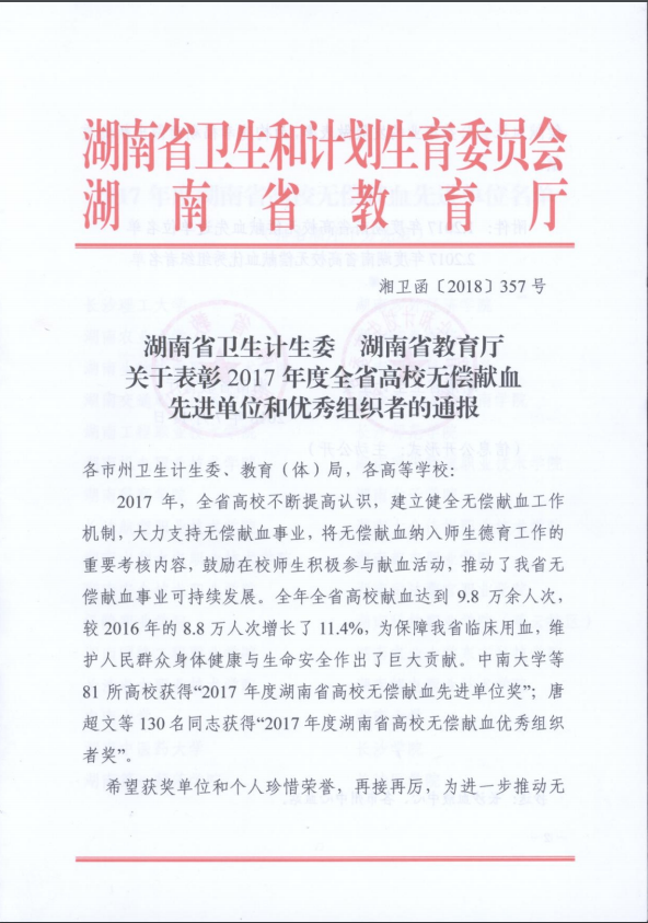 校园网讯:日前,省卫计委、省教育厅联合发发布了《湖南省卫生计生委 湖南省教育厅关于表彰2017年度全省高校无偿献血先进单位和优秀组织者的通报》(湘卫函[2018]357号)。公司继2016年度获奖后再次荣获2017年度全省高校无偿献血先进单位。副董事长刘亦工、公司党总支副书记易政群荣获2017年度湖南省高校无偿献血优秀组织者奖。