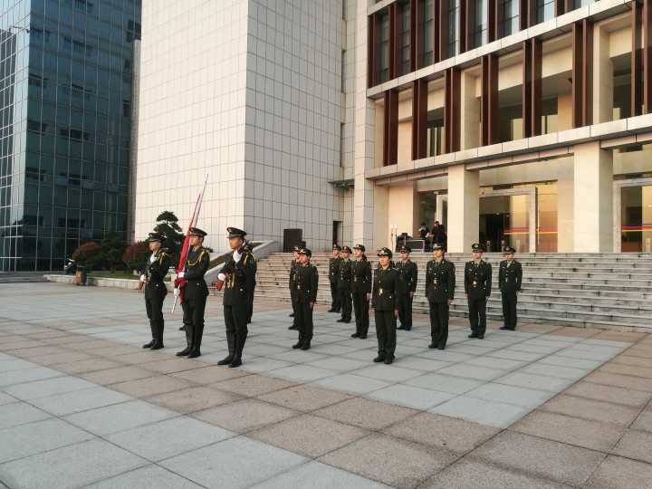国旗护卫队迎着朝阳,昂首阔步地护送国旗入场,伴随激昂雄壮的《义勇军进行曲》,全场肃立,五星红旗冉冉升起,随风舞动。
