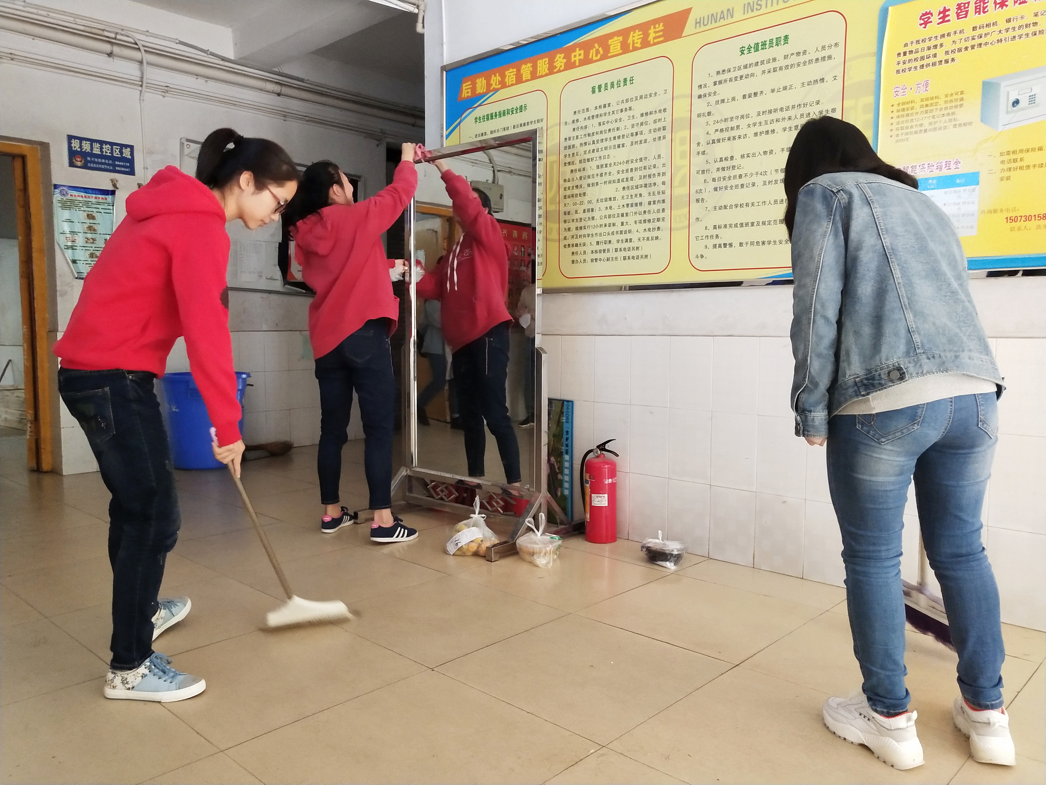 在活动期间,组织部将团员分为男、女生两队,每队分为六个小组,每组分别对10、16栋寝室楼一至六楼的垃圾桶周边、过道、以及栏杆等存在垃圾、灰尘的卫生死角进行义务打扫。
