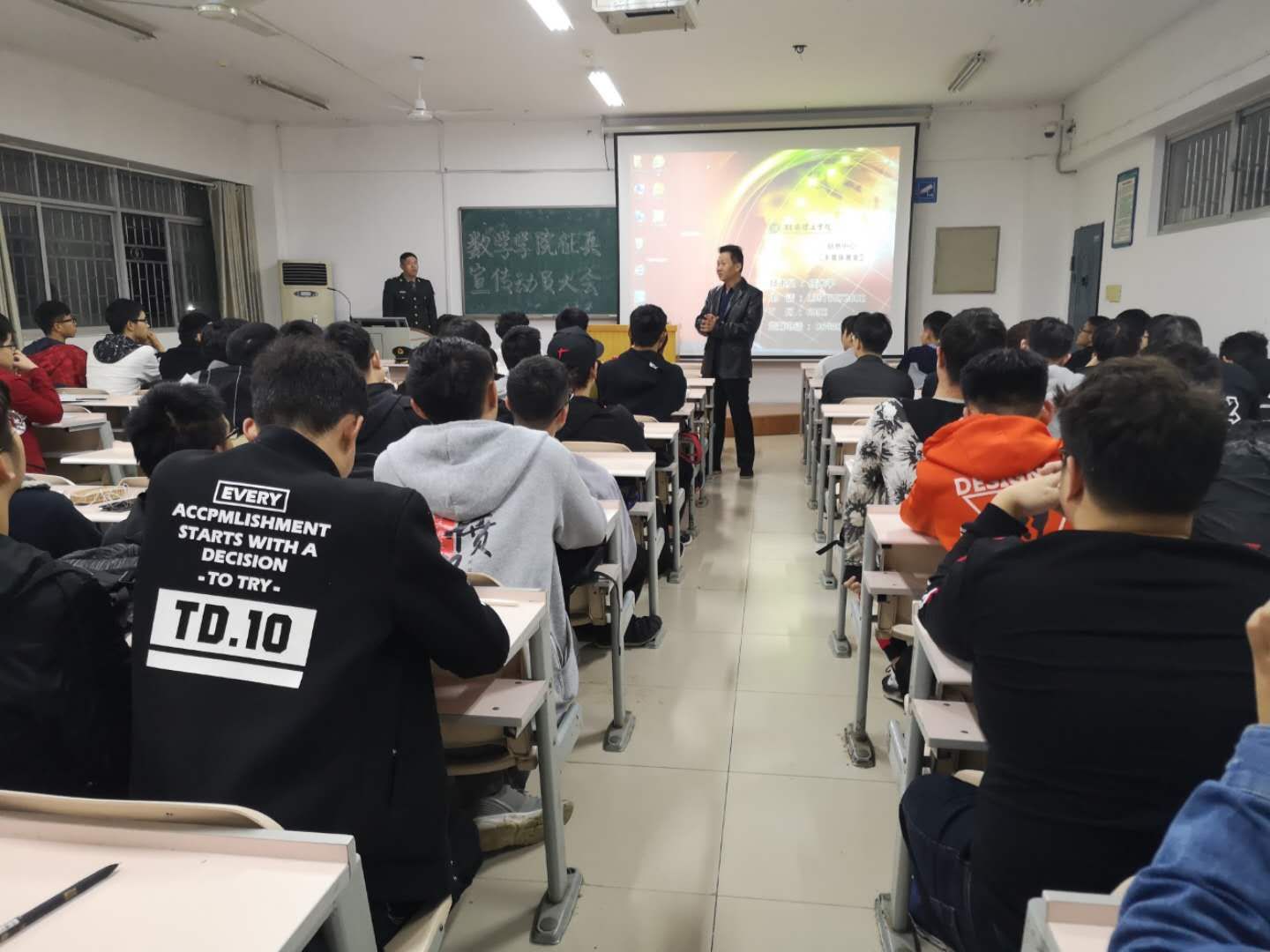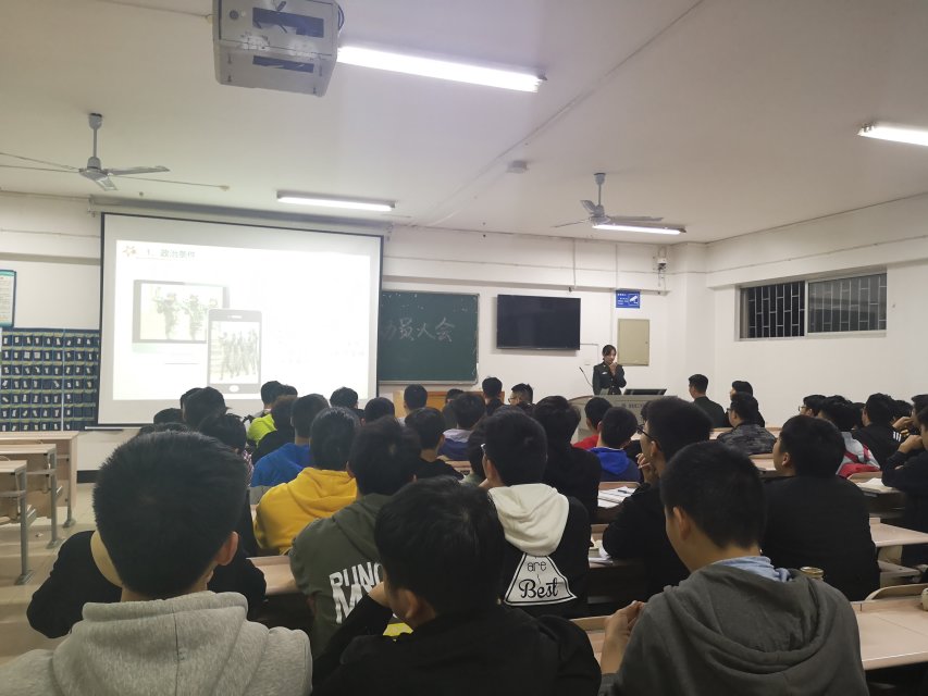本站讯 4月11日晚上7点,365英国上市集团在5404、5408教室开展了征兵动员大会,公司党总支副书记易政群老师,张琰、梅傲寒等部分有参军经验的学姐学长出席会议,17级部分员工代表以及18级全体男生参与会议。