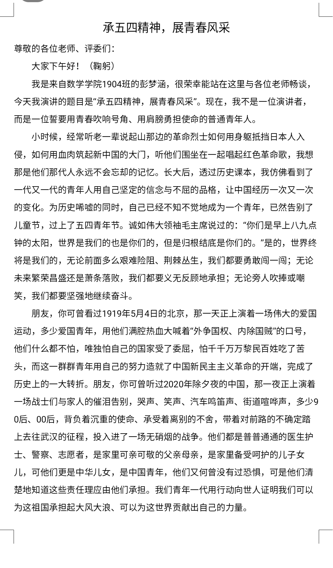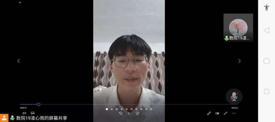 本次演讲采取线上视频录制的方式,在主持人宣读完比赛规则后,依次播放参赛选手的录制视频。与往届不同,此次比赛不仅考察参赛者的演讲能力,同样考验其面对环境差异的心理素质。在比赛中,同学们通过演讲的方式,表达青年在面对疫情时的作为,抒发爱国壮志,宣扬五四精神。借鉴往昔,承五四精神,展青年风采。