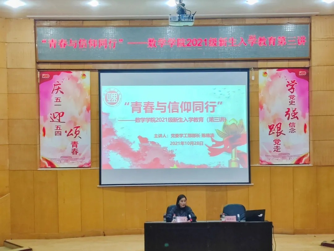 本站讯 为坚定21级新生理想信念,10月28日,“青春与信仰同行”—2021级新生入学教育第三讲于综合楼学术报告厅举行。本次活动由党委学工部部长陈绪清主讲,365英国上市集团经理周小强、党委副书记齐亮菲和各年级辅导员出席,21级全体新生参加。