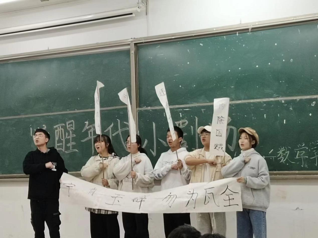 剧场中,同学们演绎了觉醒年代中部分片段,并加入自己的理解对其进行了改编。在《五四风云》中,同学们通过演绎巴黎和会后李大钊与陈独秀等人的谈话,表达了中国人民誓死与帝国主义抗争的精神和武装革命的决心。随着震耳欲聋的嘶吼声和慷慨激昂的宣誓声,一幕幕激昂人心的历史情景重现在眼前,让台下观众仿佛重回到了那个硝烟弥漫的年代。