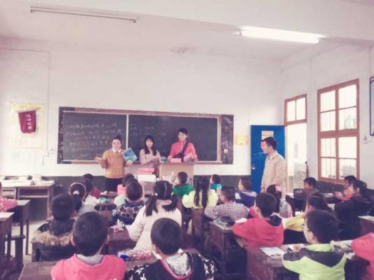志愿队带着爱心捐赠物品到达小学,按原计划由团队四名成员为三、四年级辅导数学,之后进行游戏环节;课后,团队将一部分爱心捐赠物品分发给所带两个年级,另一部分留做各班近期诊断考试的奖品,并与员工和老师合影留念。
